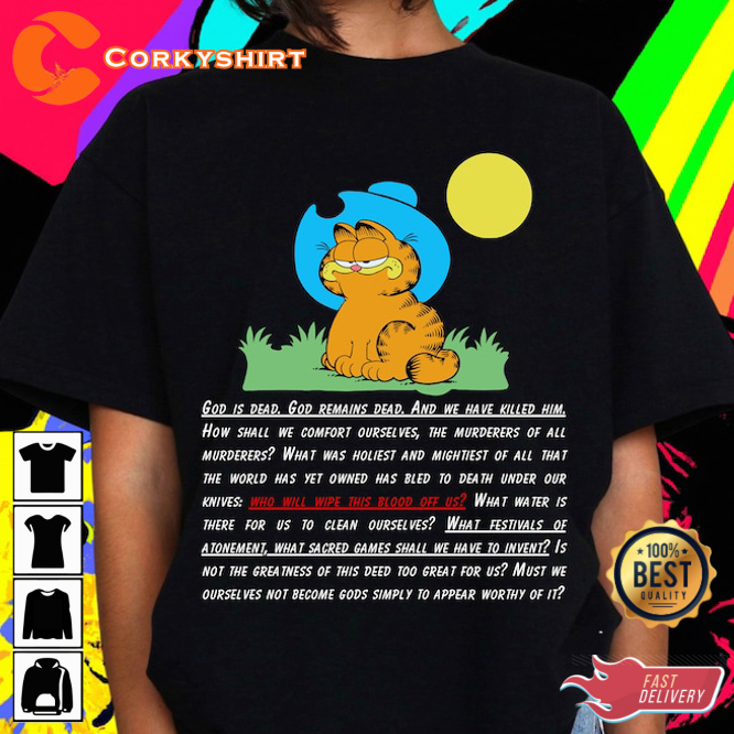 Garfield Cowboy God Is Dead Go Hard Funny Meme Quote Garfield The Cat Inspired T-shirt